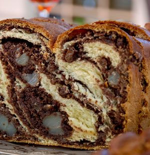 Această pâine dulce tradițională românească este nelipsită de sărbători, dar iubită pe tot parcursul anului. Infuzat cu o umplutură bogată de nuci, cacao și stafide înmuiate cu rom, cozonacul nostru este pufos, umed și aromat, perfect cu o ceașcă de cafea sau ceai.